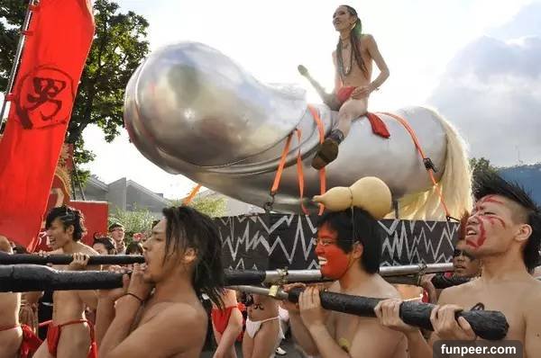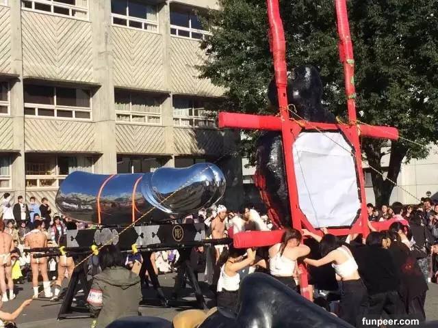 >> 學生們穿著兜襠布梳著和尚頭、莫西乾頭或是月代頭兜襠布的顏色也有講究三年級生是白色的,四年級生是紅色的 >>> 除了男神輿,還有女神輿是雕塑系的女生以女性陰部為模型製作的雕塑近年來,在演舞的時候女神輿會與男神輿一起”結合“ > 其實日本的生殖器崇拜活動並不少見日本的許多地方在傳統婚禮上或收穫的季節時都會有類似的活動這無不體現出日本人對於性生殖文化的崇拜 > 這也讓日站君聯想到了當初在中國發生的轟動一時的北外女生“陰道獨白”事件事件是這樣的: