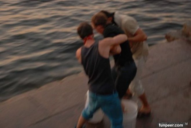 大意為: 這是發生在(俄羅斯)聖彼德堡的惡作劇事件, 一些人將他們的朋友的腿放進填裝了水泥的桶,然後企圖推他入河, 想由此获得一些乐趣! 幸好有路人阻止了即將發生的悲劇…
