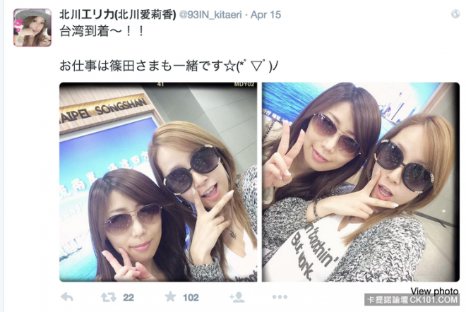 29歲的北川愛莉香(北川エリカ、園田ユリア)與34歲的篠田步美(篠田あゆみ),是日本著名的「巨乳級女優」,雖然年齡稍大,但仍擁有不少死忠粉絲。據《蘋果日報》報導,日前2人赴台拍攝AV片,地點在台北後站商圈巷道、鄭州路,以及華西街夜市等地。