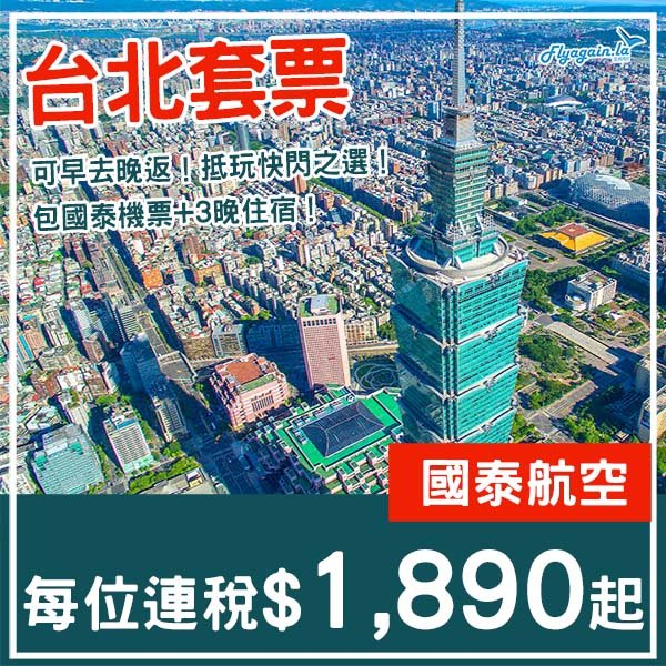 【台北】可早去晚返!多日子選擇!台北4日3夜套票,包國泰機票+住宿,每位連稅$1,890起!8月尾至12月尾出發