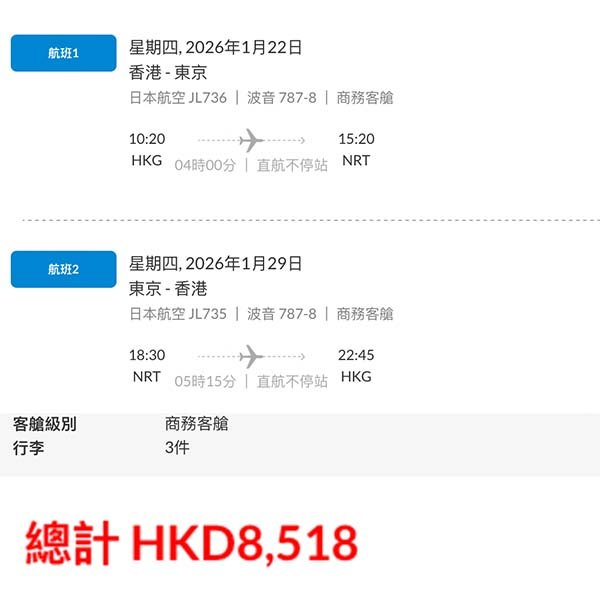 【東京】商務艙一齊減!包3件32kg寄艙行李!日本航空商務艙來回東京連稅$8,518起!9月至2026年3月指定日子出發