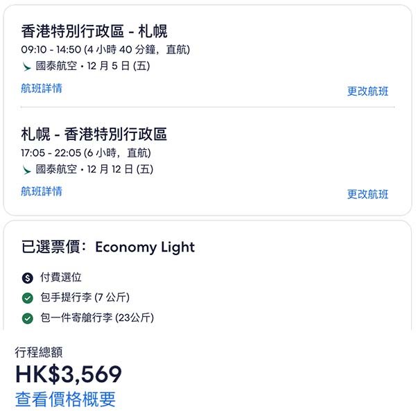 【札幌】直航又再平咗!12月都有啦!國泰航空來回札幌連稅$3,569起!8月至12月指定日子出發