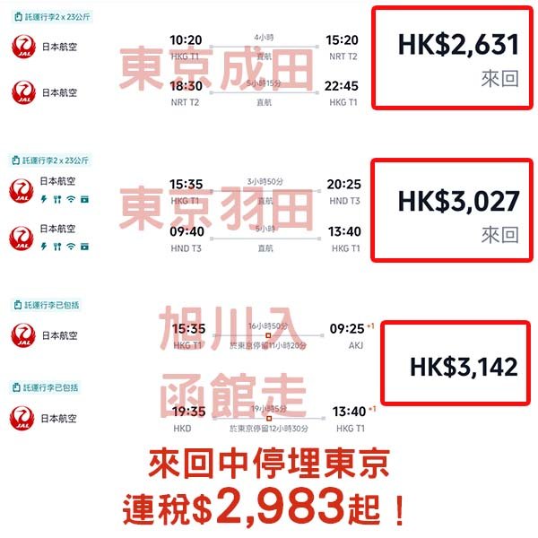 **優惠可以open jaw,如旭川入函館走,來回連稅HK$3,142起;來回中停埋東京(香港來回成田+羽田來回其他日本航點)就連稅HK$2,983起!**