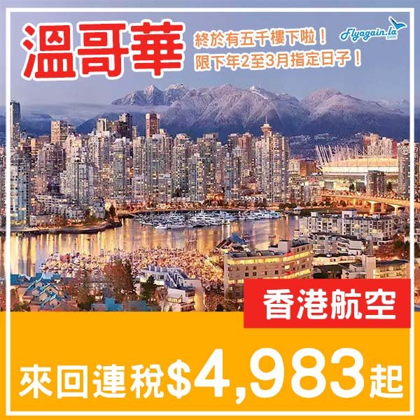 【溫哥華】抵!好耐冇見四字頭!香港航空直航來回溫哥華連稅$4,983起!2026年2月至3月指定日子出發