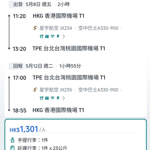 航空公司:國泰航空(CX)*可自行選擇其他航空公司,價錢會相應調整