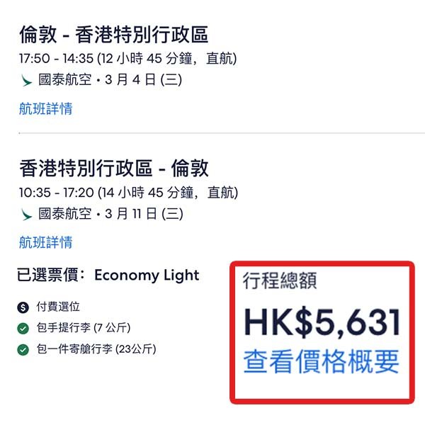 結論:坐國泰倫敦香港直航,雖然係淡季,但低過六千都值得入手呀!想返香港探親探朋友,就係時候book返張飛啦~