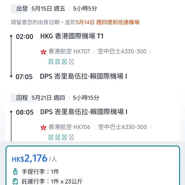 結論:港航加完第一次燃油附加費後,都仲可以做到二千頭,真係幾抵,國泰同期要三千五以上,平成截呀!雖然航班時間冇咁靚,但咁抵真係冇投訴,加上峇里消費唔太高,想平平地去峇里度返幾日假歎下,可以一諗!留意最抵價要用Mastercard俾錢,唔係會貴幾十蚊~