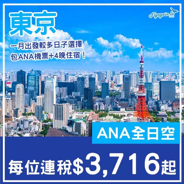 以2026年1月22日出發,1月26日回程(5日4夜)週末遊為例,包ANA來回機票+4晚酒店,每位連稅只係HK$3,716起(兩人一房計)!
