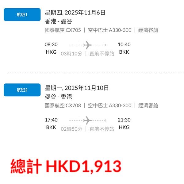 結論:國泰勝在航班夠多,一日有多達七班機揀,可以揀早去晚返,連暑假都照有平冇加價,價錢比上次平咗少少,值得入手!今次開放埋10至11月,想去快閃曼谷食玩買返幾日,可以plan下啦~