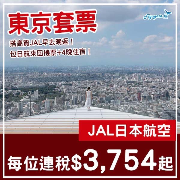【東京】坐JAL早去晚返!東京5日4夜套票,包日航機票+住宿,每位連稅$3,754起!7月至2026年2月指定日子出發