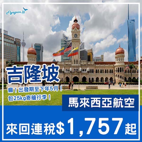 【吉隆坡】特長出發期!可以早去晚返!馬來西亞航空來回吉隆坡連稅$1,757起!9月至2026年5月指定日子出發