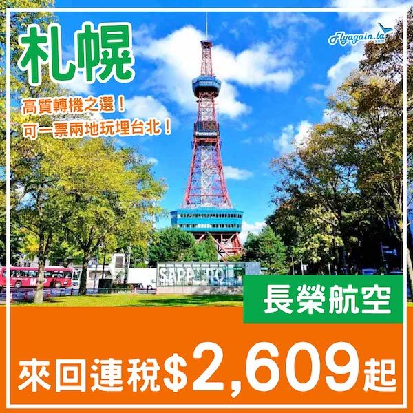 【札幌】高質轉機盤!可一票兩地中停玩台北!長榮航空來回札幌連稅HK$2,609起!2026年5月29日或之前出發