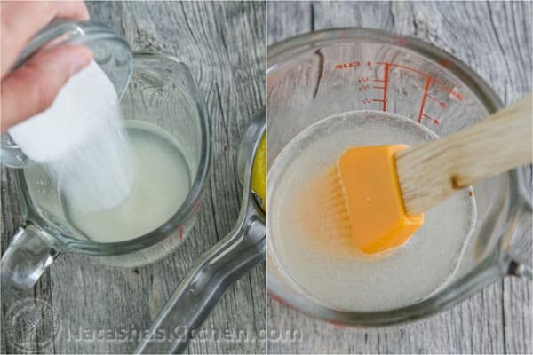 How to Make Lemon Syrup:1. In a measuring cup, combine 1/4 cup water, 2 Tbsp sugar and 2 Tbsp lemon juice and stir until sugar is dissolved. Set aside until needed.