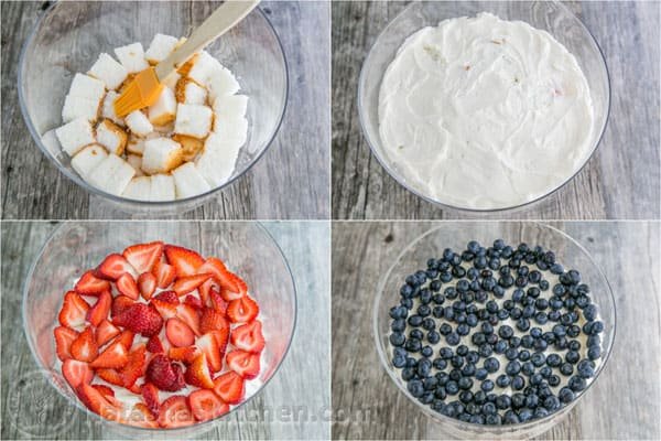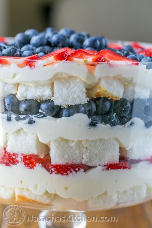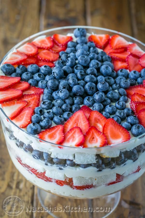 Assembling the patriotic blueberry trifle:1. Place 1/3 of your sliced angel food cake into the bottom of your trifle dish and brush with 1/3 of your syrup. Add 1/3 of your cream and loosely spread it over cake pieces. Add 1/2 of the sliced strawberries. Repeat with remaining ingredients (adding 1/2 of the blueberries for the second fruit layer). Frost the top with last 1/3 of cream and decorate with remaining fruit.