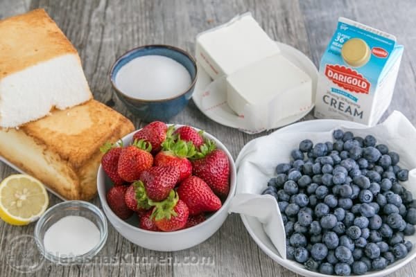 This strawberry blueberry trifle recipe requires zero baking and it takes about 30 minutes to make! The sweet/tartness of the fruit, melt-in-your-mouth soft angel food cake and lightly sweetened cream come together so well. If you don’t have a trifle dish, you could easily put this in a large glass pyrex dish and it would still be fabulous.