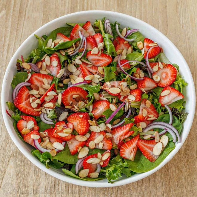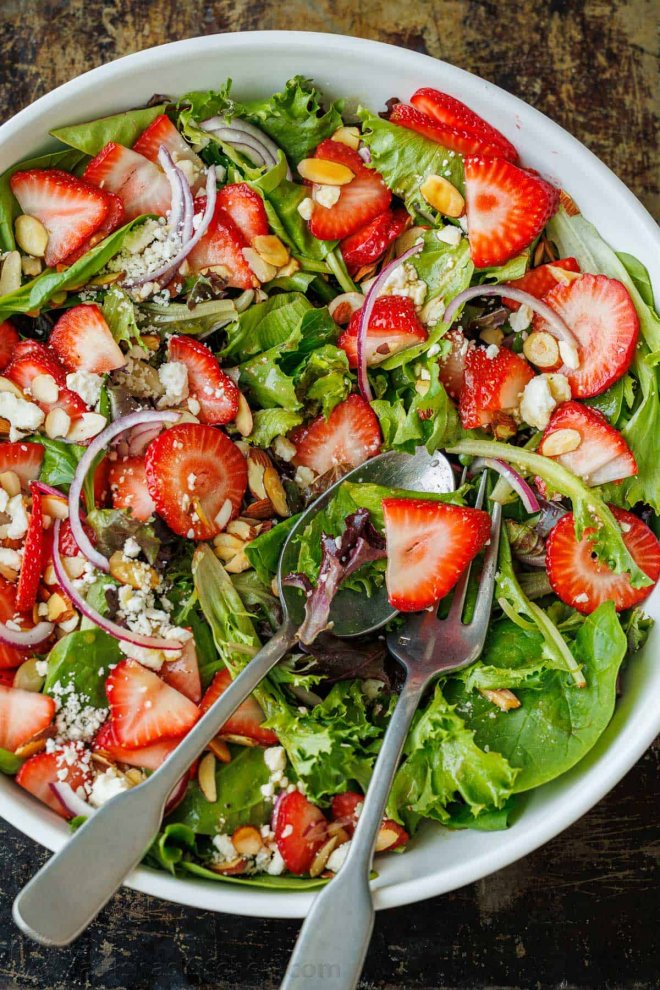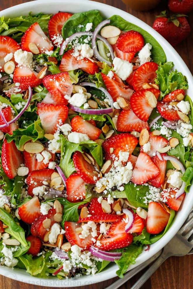 Versatile – I’ve included some variations below to make this salad fit your tastes and any dietary needs Strawberry Salad VideoWatch Natasha assemble this fresh summer Strawberry salad comes together in only a few minutes. You’ll love the contrast of sweet strawberries and toasted almonds, and it also looks divine!