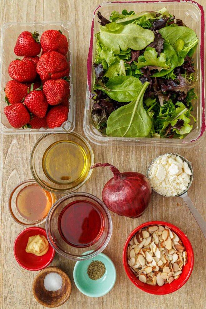 Ingredients for Strawberry SaladEach ingredient in our delicious Strawberry Salad with Honey Vinaigrette adds something special to the salad—sweetness, crunch, creaminess, bite, and richness—which makes for a truly well-balanced and delicious salad with many layers of texture and flavor.