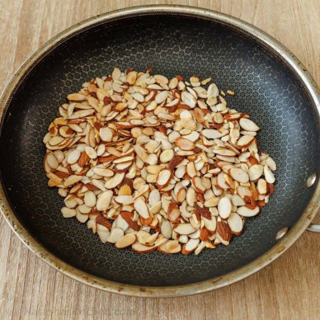 Toast the Almonds – toss the nuts in a skillet over medium heat. Toss frequently to avoid burning and toast until golden, for about 5 minutes.