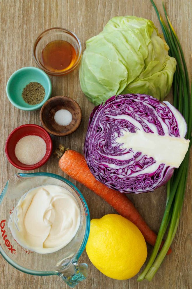 Green Cabbage – you’ll need 6 cups of loosely packed, finely shredded green cabbage (see my tips for finely shredding below) – this is about half a head of green cabbage.Red Cabbage – I recommend no more than 2 cups of red cabbage (avoid adding too much or it will tint your salad dressing pink).Carrot – 1 large carrot adds a nice contrast of color. You can add more if you prefer. Green Onion – about half a small bunch of green onion will yield half a cup chopped. It adds a fresh layer of flavor to a traditional coleslaw.Creamy Homemade Dressing – the perfect blend of mayonnaise, lemon juice, salt, and pepper, perfectly sweetened with honey.