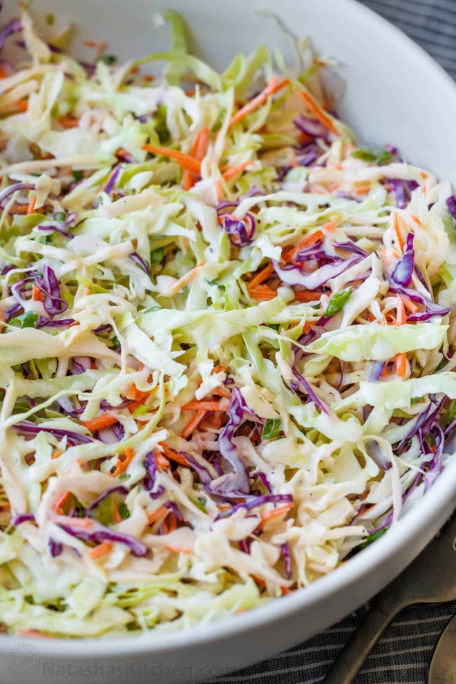 Coleslaw RecipeThough you can purchase a store-bought coleslaw mix and dressing, nothing beats the homemade version. Not only is it so easy and quick to make, it’s less expensive and it requires minimal ingredients that you likely already have in your fridge. Crunchy shredded cabbage with carrots in a creamy dressing – so good!