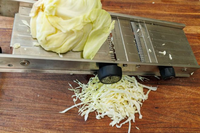 Natasha’s Tip for Finely Shredded CabbageYou can either shred the cabbage with a mandolin slicer or by hand with a sharp knife. If you like your coleslaw shredded fine and uniform in size, use a mandolin slicer. If you prefer chunky cabbage, shredding by hand will work.