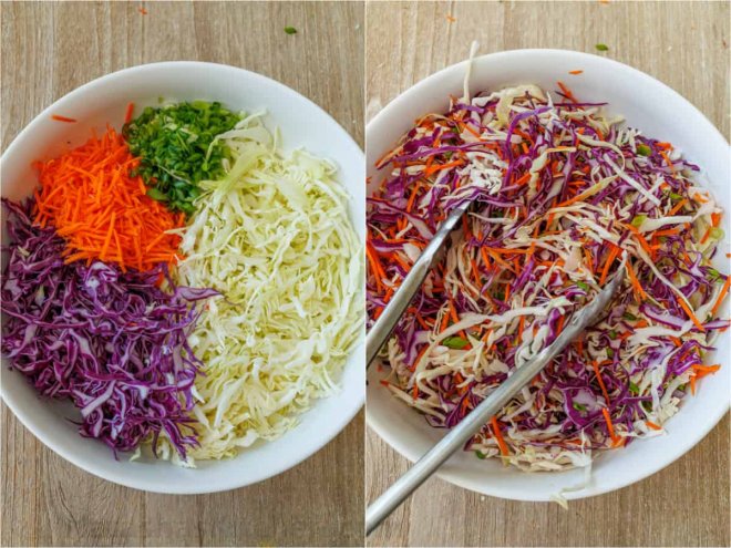 Shred the cabbage, grate the carrots (we used our favorite julienne slicer for the carrots), and chop the green onions. Transfer all of the salad ingredients to a mixing bowl and toss to combine.Combine the ingredients for the homemade dressing.Add the dressing to the mixed salad and enjoy!