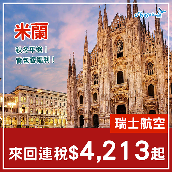 【米蘭】背包客福利!瑞士航空來回連稅$4,213起,加$900起包23kg行李,11月30日前出發