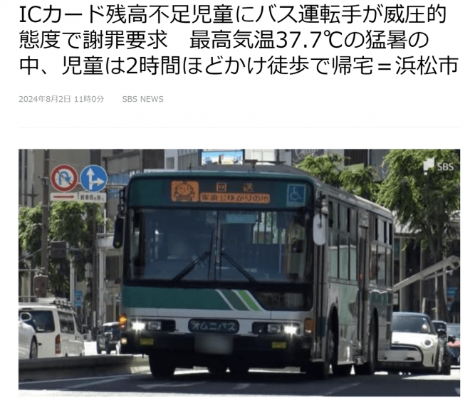 在日本,一名男童搭乘公車回家時,發現IC卡餘額不足無法刷卡。當他試圖解決問題時,公車司機以強硬態度要求男童道歉。男童因感到害怕而低頭不語,最終在38度高溫下徒步回家,未能轉乘下一班公車。