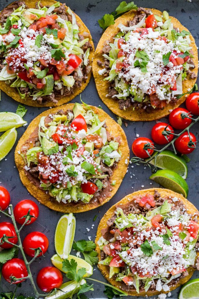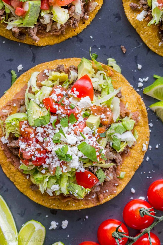 Homemade Tostadas are so satisfying and easy to make. They’re loaded with refried beans and beef and topped with classic Mexican Tostada toppings—don’t forget the squeeze of lime! Every bite is so fresh, crisp, and satisfying—I can almost hear the crunch…