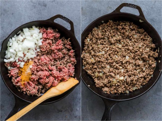 Bake Tostada Shells – See the easy instructions above to make the shells.Make the Taco Meat – Cook the ground beef in a skillet, breaking it up with a spatula. Season the beef with garlic powder, taco seasoning and salt, to taste. Add the diced onion and continue cooking until the onion is soft and translucent, and beef is fully cooked.