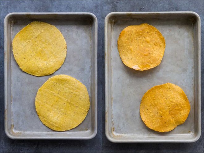How to Make Tostada ShellsYou can buy crunchy “tostadas” but making your own tostadas is quick and easy. The shells can be made by either baking or frying. We prefer to bake the tortillas as a healthier option that still gets crispy and you can make more at once. It’s a super simple process: