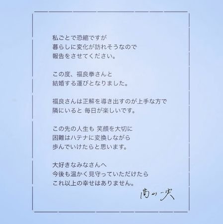 高山一實今晨透過IG宣布結婚,並形容男方是一位擅長找出正確答案的人。「和他在一起,每天都很開心。今後的人生中,我們會珍惜笑容,將困難轉化為力量,一起走下去。」她希望眾人能夠溫暖地守護他們,「那將是我最大的幸福。」