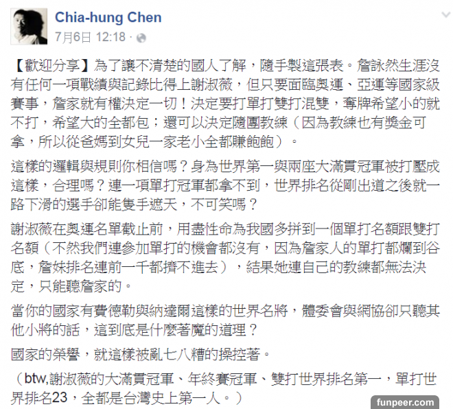 這位網友質問:「這樣的邏輯與規則你相信嗎?身為世界第一與兩座大滿貫冠軍被打壓成這樣,合理嗎?連一項單打冠軍都拿不到,世界排名從剛出道之後就一路下滑的選手卻能隻手遮天,不可笑嗎?」、「當你的國家有費德勒與納達爾這樣的世界名將,體委會與網協卻只聽其他小將的話,這到底是什麼著魔的道理?國家的榮譽,就這樣被亂七八糟的操控著。」![]()