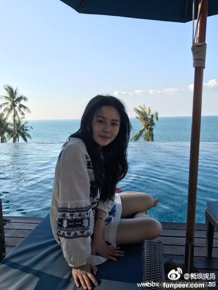 近日她在網路PO出多張美照,她坐在泳池旁邊,