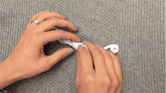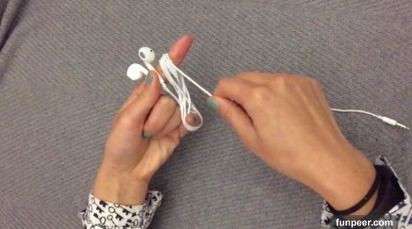 只要像他一樣擺出這樣的手勢就可以把耳機線收好了。