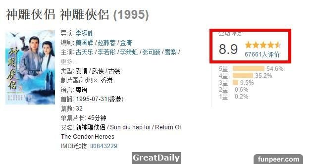 是的,95版的《神鵰俠侶》有多經典沒經歷過的人不會明了。相隔近20年,豆瓣上6萬多觀眾打分,仍給出8.9的高分。