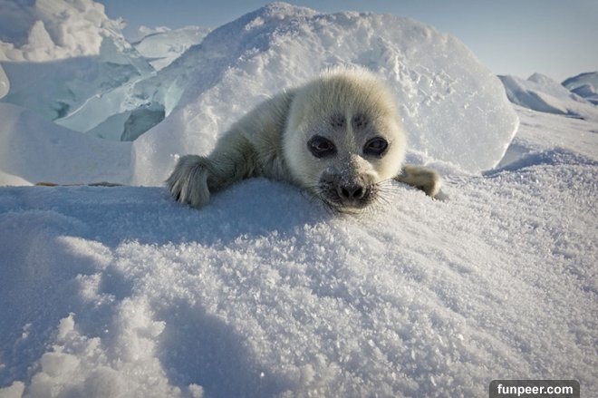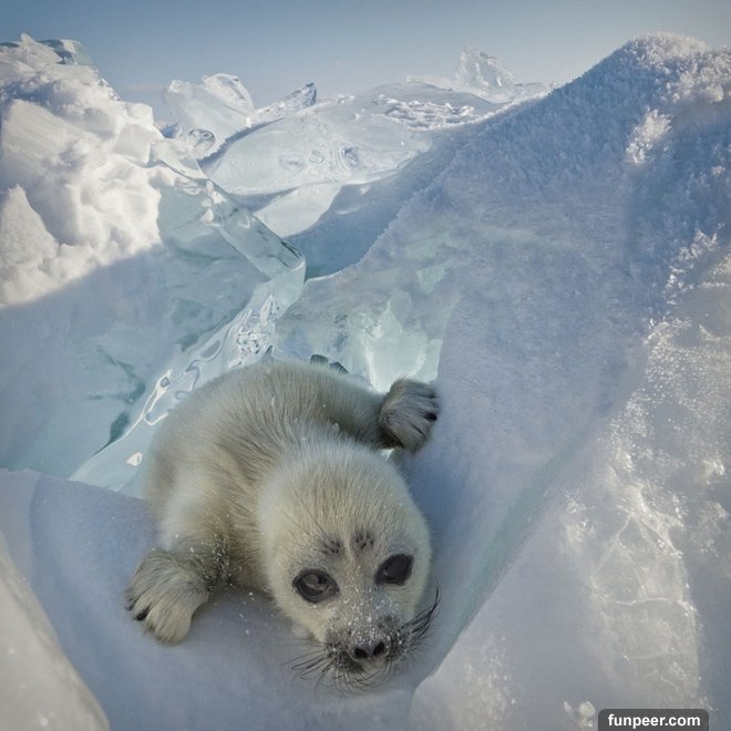 小海獅(source:boredpanda)Alexey表示,海豹是種很害羞又很謹慎的動物,只要一點點動靜就會驚動他們,因此很難拍攝成功,一直到這隻剛出生的小海豹爬上了冰面。