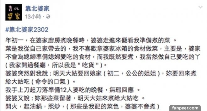 以下為全文內容:---------------------------------------------年初一,在婆家廚房煮晚餐時,婆婆走進來翻看我準備煮的菜 。菜是我從自己家帶去的,我不喜歡拿婆家冰箱的食材做菜,主要是,婆家不會為媳婦準備媳婦愛吃的食材,而我既然要煮, 我當然做自己愛吃的ㄚ (我家開過餐廳,所以我是 " 吃貨 " )。非會員才能看廣告~婆婆突然對我說 : 明天大姑要回娘家 ( 初二,公公的姐姐 ),妳要回來煮給大姑吃 ( 命令的口氣 ) 。我手上刀起刀落準備12人要吃的晚餐,無瑕回應 。婆婆又說 : 妳那些菜留著,明天大姑來煮給大姑吃 。 開火,起油鍋,照炒,( 那些是我配的菜色,婆婆不會煮 )婆婆在旁邊跳腳一直唸 : 跟妳說那些菜要煮給大姑一家人吃的,妳怎麼一直煮 ........妯娌走進來聽婆婆碎唸後說 : XX不在還有我ㄚ~