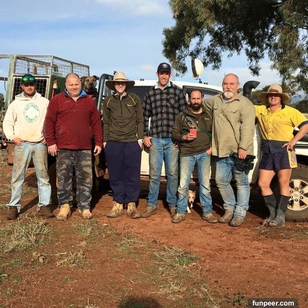 ▼湯金斯(右四)的真實身份是一位大象飼育員,34歲的他是兩個孩子的爸,身高足足有200公分(難怪袋鼠會嚇到);他參與這場狩獵之旅其實是有理由的,目的就是要幫他的好友巴威克(Kailem Barwick,左三)完成心願。