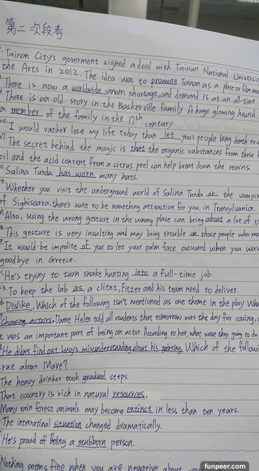 ▼然而這名女學生卻自動自發地把做錯的題目和答案,乖乖地罰寫1遍,寫了滿滿2頁,然後放在老師桌上,留下一張紙條表示「希望老師看在我很熱愛學習英文的份上,能夠斟酌給我0.5分」,讓老師不禁感歎「如果你/你/妳是老師,會因為她在字條上說的那些話而幫她加分嗎?」
