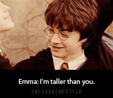 ▼艾瑪抬頭挺胸表示自己比丹尼爾高,丹尼爾無奈道:「別再仰頭了,你這算作弊喔!」