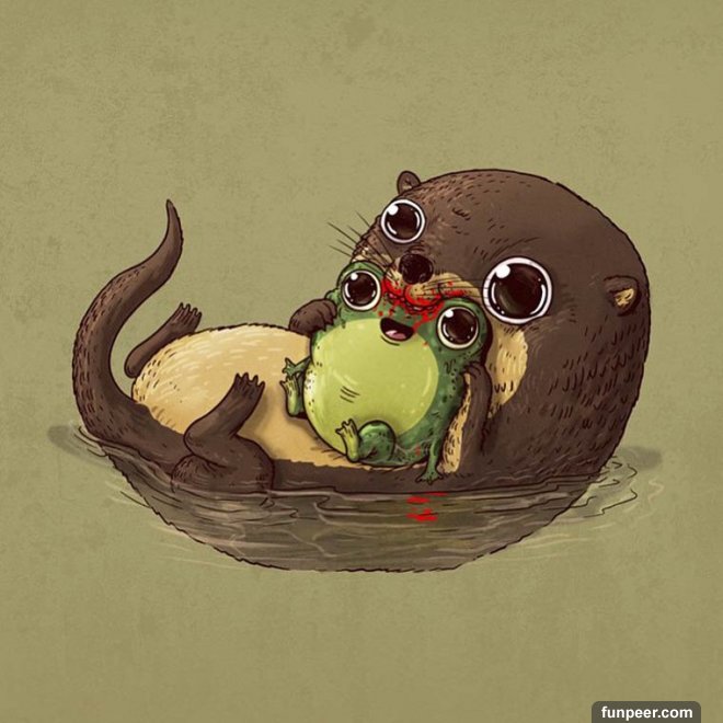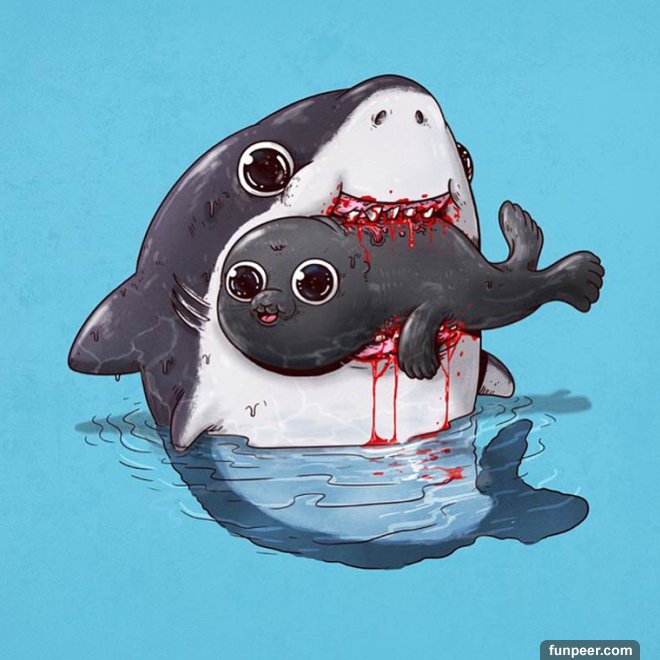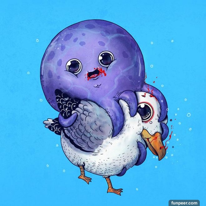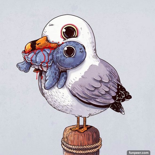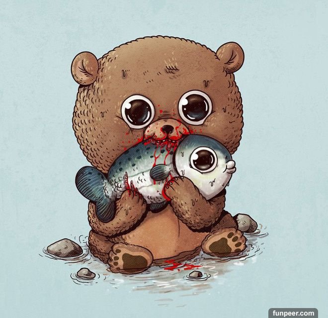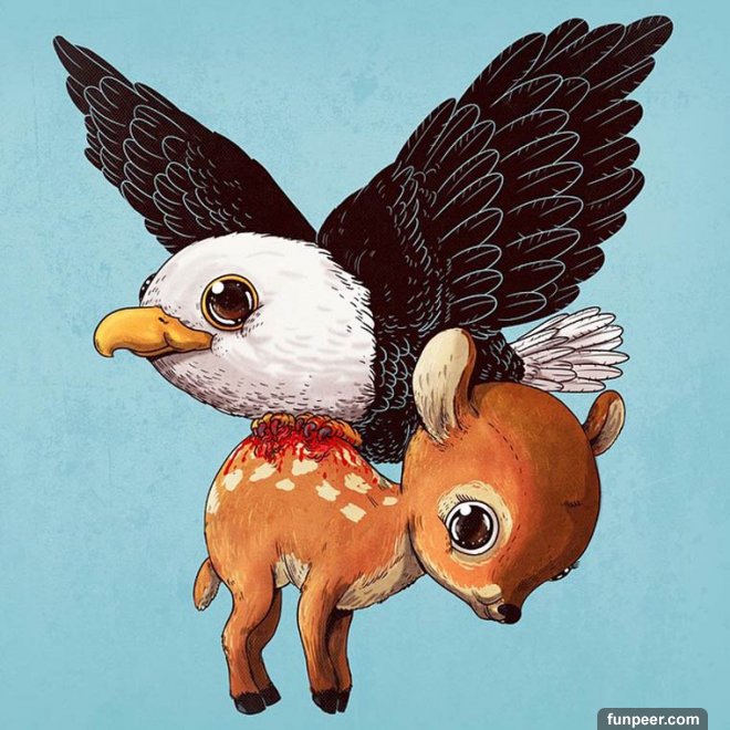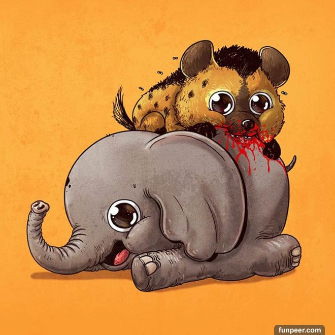 如果現實中動物們都長成這樣,根本沒必要費盡心思去打獵,自然有很多人類主動送上門,願意給牠們好吃的。不知道Alex是在什麼情況下畫出了這些畫風詭異的插畫,觀看的人很容易就忽略了裡面的血跡,感覺全都超可愛的。趕快分享出去吧!