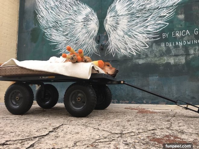 ▼因為身體原因,馬維克不能自行走動,Joey在附近的商店裡找了一台大拖車,每天下午帶牠出門玩。知道自己又能出去玩,馬維克非常開心,又露出了可愛的笑容。牠趴在拖車上,咬著最愛的長頸鹿玩具東張西望,對周圍的一切充滿好奇。