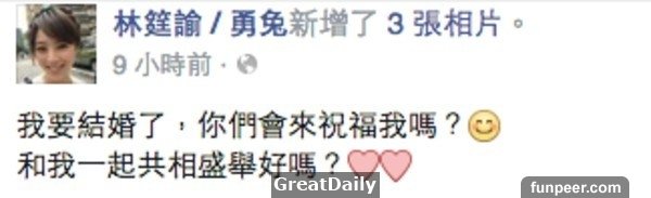 (圖片翻攝自勇兔臉書,下同)勇兔5日在臉書分享3張婚紗照,分別穿著漂亮甜美的白色婚紗,以及火辣的紅色禮服,臉上還帶著害羞靦腆的笑容,向粉絲宣告:「我要結婚了,你們會來祝福我嗎?和我一起共襄盛舉好嗎?」讓不少網友驚訝直呼「好美」、「要嫁給誰」、「真的假的啦」,她則再次回應「結婚了」,引來許多人留言獻上祝福。