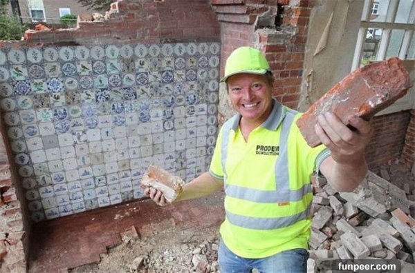 拆屋的工作很辛苦,但這名工人居然在拆屋途中意外發現了這一面特別的牆,讓他鹹魚翻身!