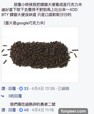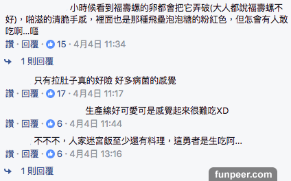 「福壽螺的蛋苦苦的,有點馬桶那個藍色的清潔錠氣味。重點是它裡面的液體不是水水的,而是像痰一樣半凝固。以前小時候在老家水田旁邊看到以為是甚麼覆盆梅那種的拔下來就往嘴裡塞,然後拉了10來天……」謝謝你,勇者。