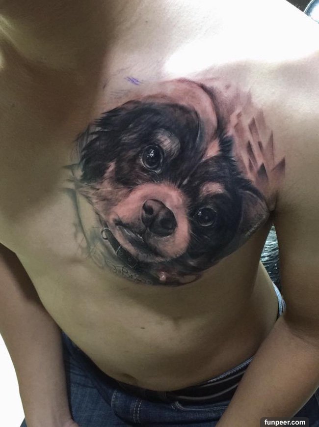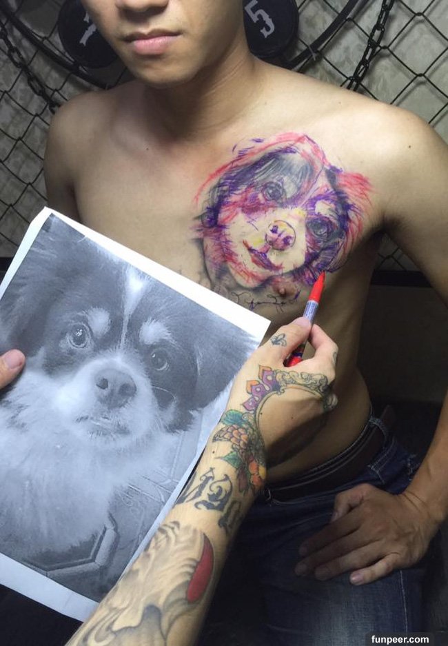 為了徹底告別這段感情,男子衝去找當初的那位刺青師,請他改造胸前的頭像,刺青師仔細端倪一了一陣子,因為男子喜歡毛小孩的關係,他當場決心「化腐朽為神奇」、來看看刺青師的設計圖!
