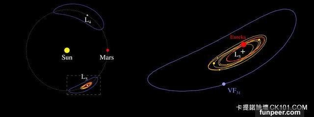 7個特洛伊天體分佈在火星附近尤里卡天體附近的L5拉格朗日點,其他特洛伊小行星的軌道在火星另一邊繞軌道。這已經暗示他們來自同一個地方。