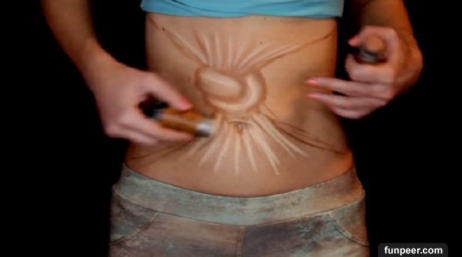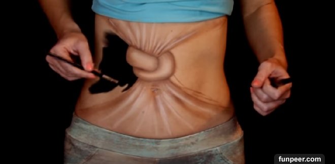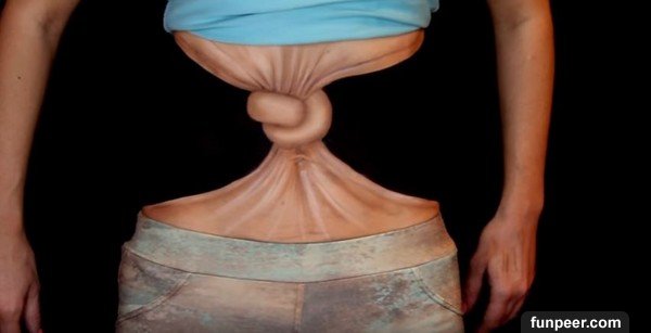 最後把其他皮膚用黑色顏料整個塗滿,只留下正中間的繩結!利用黑色背景製造出錯視的效果,肚子打結的驚人成品就出現在眼前了!