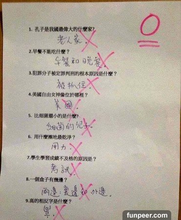 孔子是最偉大的...「老人家」、早餐不能吃...「午餐和晚餐」,超有創意又合理的答案,讓眾多網友佩服得五體投地!紛紛稱讚他:「未來應該是哲學家!」、「看不出來錯在哪裡啊!」、「這叫跳脫框架思考」。![]()